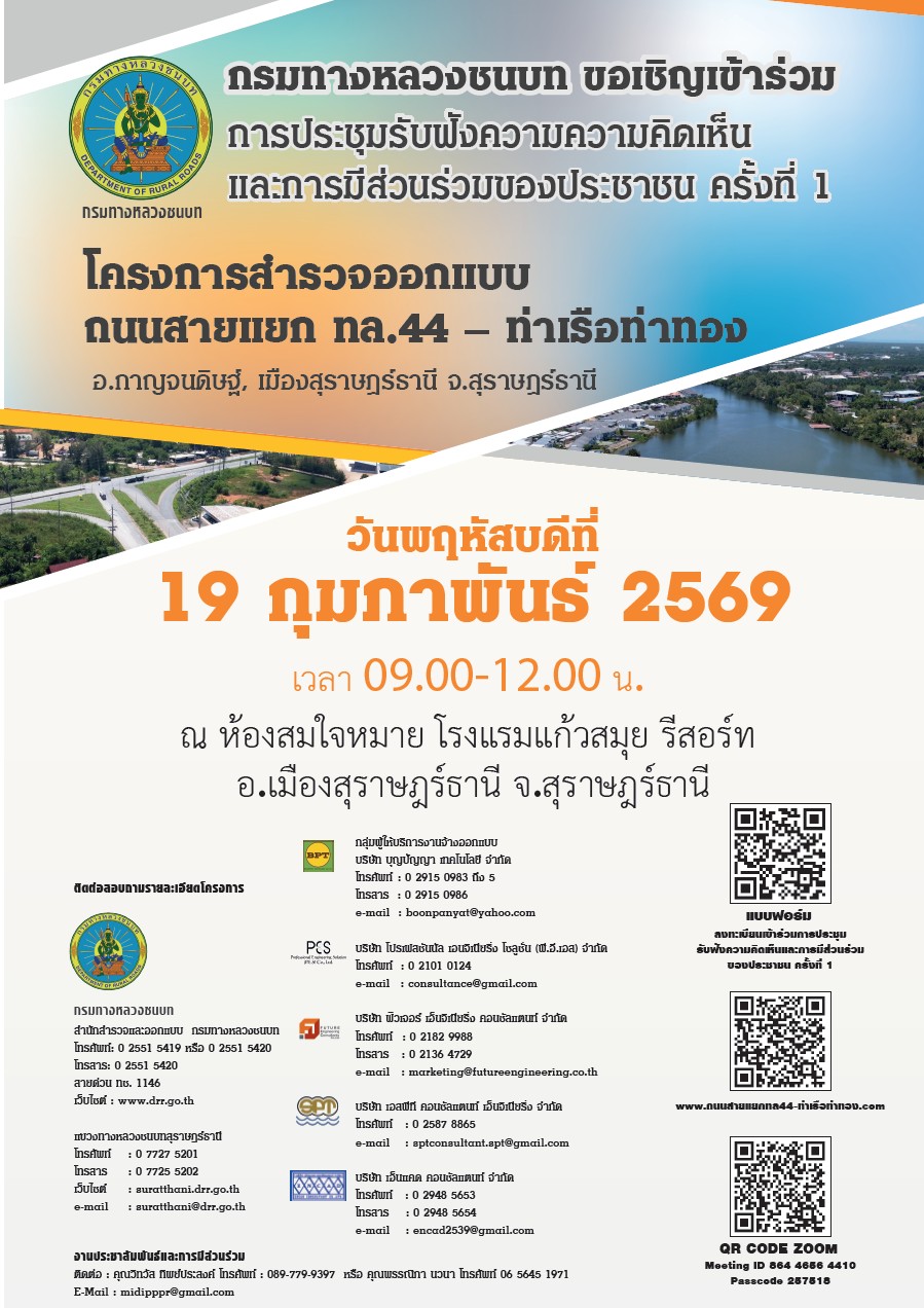 สำนักสำรวจและออกแบบ กรมทางหลวงชนบท อยู่ระหว่างดำเนินงานศึกษาโครงการสำรวจออกแบบถนนสายแยก ทล.44 – ท่าเรือท่าทอง อ.กาญจนดิษฐ์,เมืองสุราษฎร์ธานี จ.สุราษฎร์ธานี เพื่อให้ทุกภาคส่วนที่เกี่ยวข้อง ได้รับทราบถึงข้อมูลเกี่ยวกับการดำเนินงานและเกิดความเข้าใจที่ถูกต้องเกี่ยวกับโครงการ รวมทั้งเกิดการบูรณาการทางความคิดกับทุกภาคส่วน ได้กำหนดให้มีการประชุมรับฟังความคิดเห็นและการมีส่วนร่วมของประชาชน ครั้งที่ 1