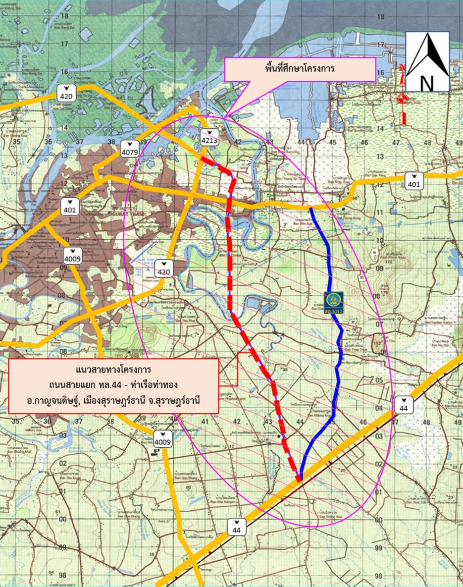 โครงการสำรวจออกแบบถนนสายแยก ทล.44 – ท่าเรือท่าทอง อ.กาญจนดิษฐ์, เมืองสุราษฎร์ธานี จ.สุราษฎร์ธานี ตั้งอยู่บริเวณพื้นที่อำเภอกาญจนดิษฐ์ และอำเภอเมืองสุราษฎร์ธานี จังหวัดสุราษฎร์ธานี ดังแสดงในรูป แสดงดังรูปที่ 1