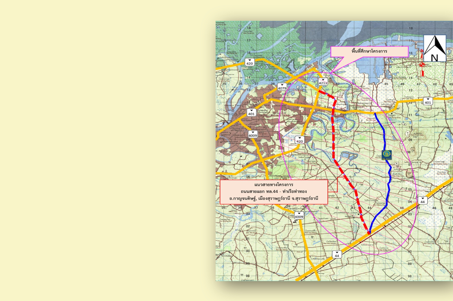 ตามที่รัฐบาลได้มีแผนขับเคลื่อนการพัฒนาเศรษฐกิจและสังคมกลุ่มจังหวัดภาคใต้ฝั่งอ่าวไทยและฝั่งอันดามัน ซึ่งมีภารกิจเพื่อพัฒนาระบบโลจิสติกส์ สนับสนุนการพัฒนาโครงข่ายเส้นทางเพื่อเชื่อมต่อระบบขนส่งให้ครอบคลุมทั้งพื้นที่จังหวัดสุราษฎร์ธานี โดยมอบหมายกรมทางหลวงชนบทดำเนินโครงการก่อสร้างถนนสายแยก ทล.44 ท่าเรือท่าทอง อ.กาญจนดิษฐ์, เมืองสุราษฎร์ธานี จ.สุราษฎร์ธานี เพื่อเชื่อมต่อการเดินทางระหว่างการขนส่งทางน้ำกับการขนส่งทางบก โดยเชื่อมระหว่างทางหลวงแผ่นดินหมายเลข 44 ทางหลวงแผ่นดินหมายเลข 401 และท่าเรือท่าทอง ทั้งนี้โครงการดังกล่าวยังสามารถแก้ไขปัญหาจราจรด้วยการสร้างทางเชื่อม (Missing Link) ให้สมบูรณ์ยิ่งขึ้น และพัฒนาเป็นทางลัด (By Pass) ทางเลี่ยง (Shortcut) ตลอดจนส่งเสริมการพัฒนาด้านเศรษฐกิจในพื้นที่และสอดคล้องกับยุทธศาสตร์เสริมสร้างระบบบริการสาธารณะที่มีคุณภาพมาตรฐานและรองรับสภาพความเจริญของจังหวัดสุราษฎร์ธานี