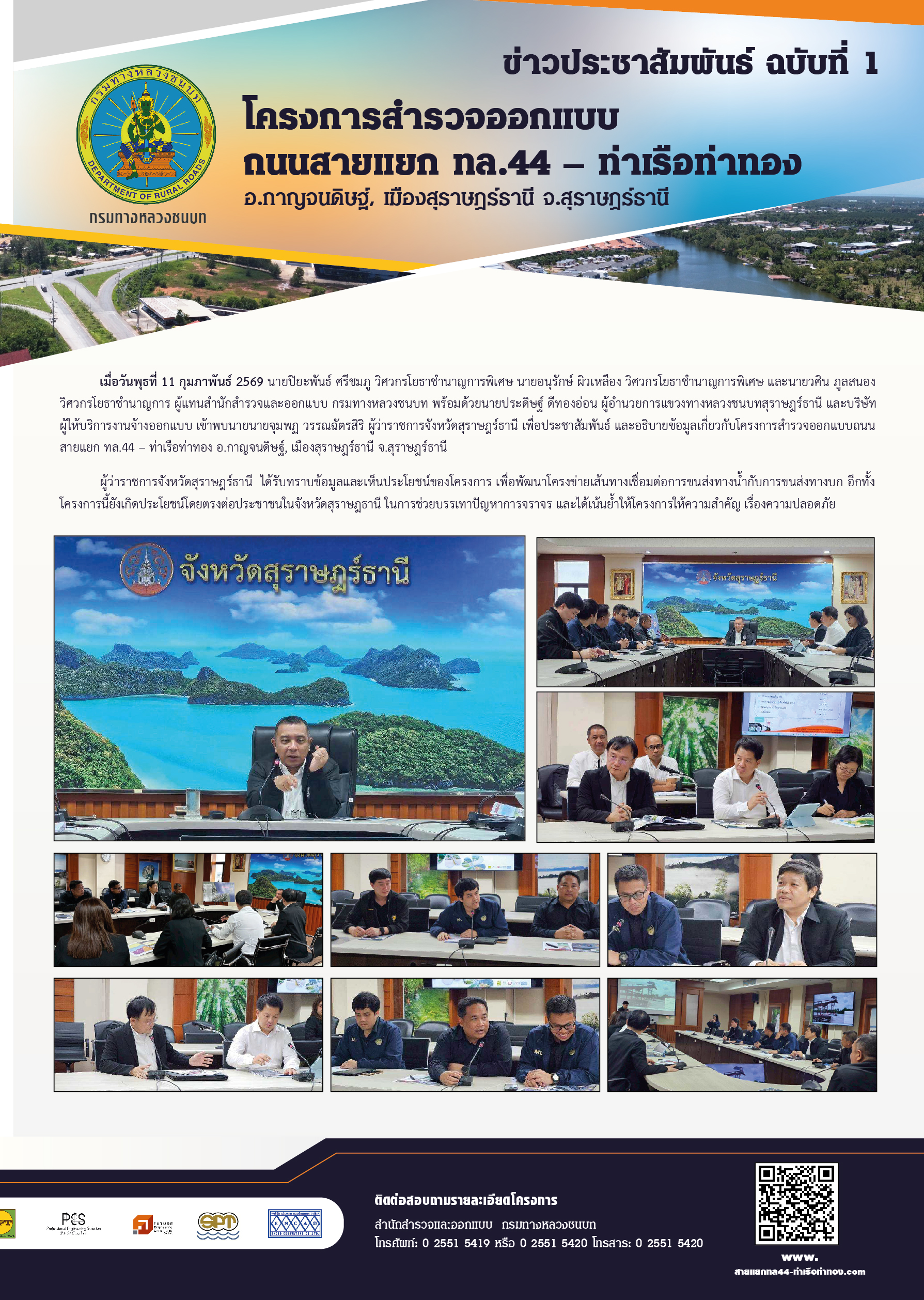 สำนักสำรวจและออกแบบ กรมทางหลวงชนบท อยู่ระหว่างดำเนินงานศึกษาโครงการสำรวจออกแบบถนนสายแยก ทล.44 – ท่าเรือท่าทอง อ.กาญจนดิษฐ์,เมืองสุราษฎร์ธานี จ.สุราษฎร์ธานี เพื่อให้ทุกภาคส่วนที่เกี่ยวข้อง ได้รับทราบถึงข้อมูลเกี่ยวกับการดำเนินงานและเกิดความเข้าใจที่ถูกต้องเกี่ยวกับโครงการ รวมทั้งเกิดการบูรณาการทางความคิดกับทุกภาคส่วน ได้กำหนดให้มีการประชุมรับฟังความคิดเห็นและการมีส่วนร่วมของประชาชน ครั้งที่ 1